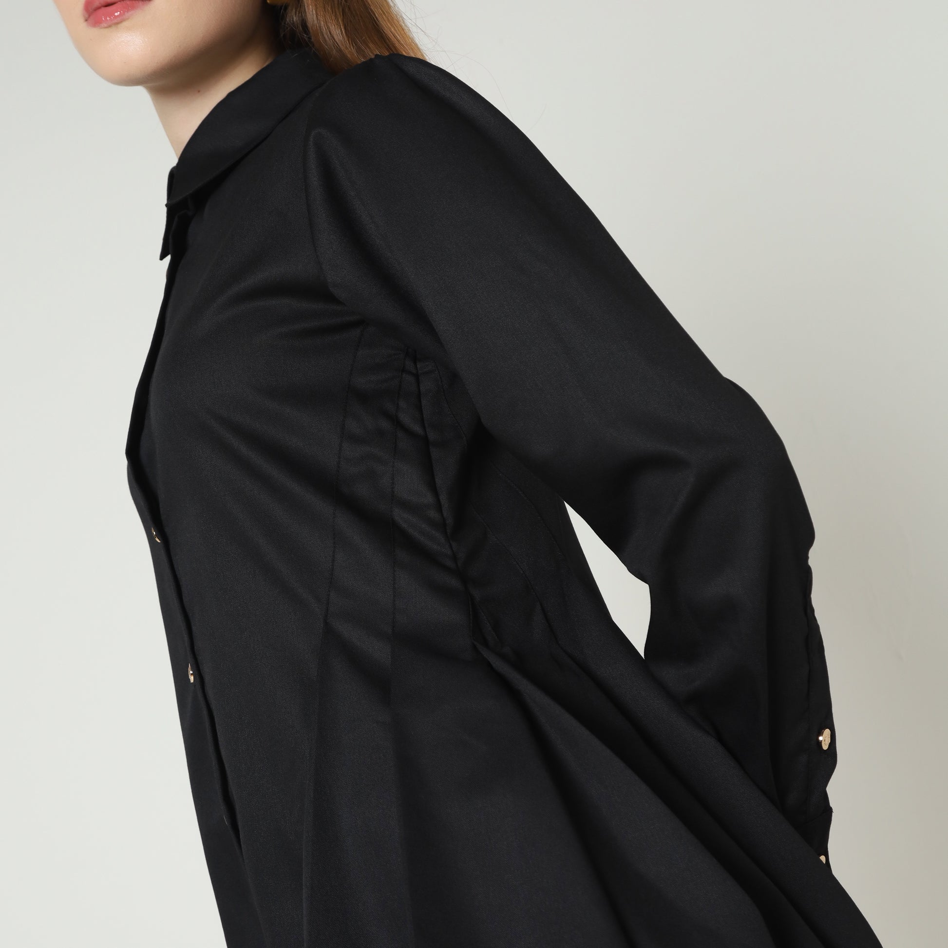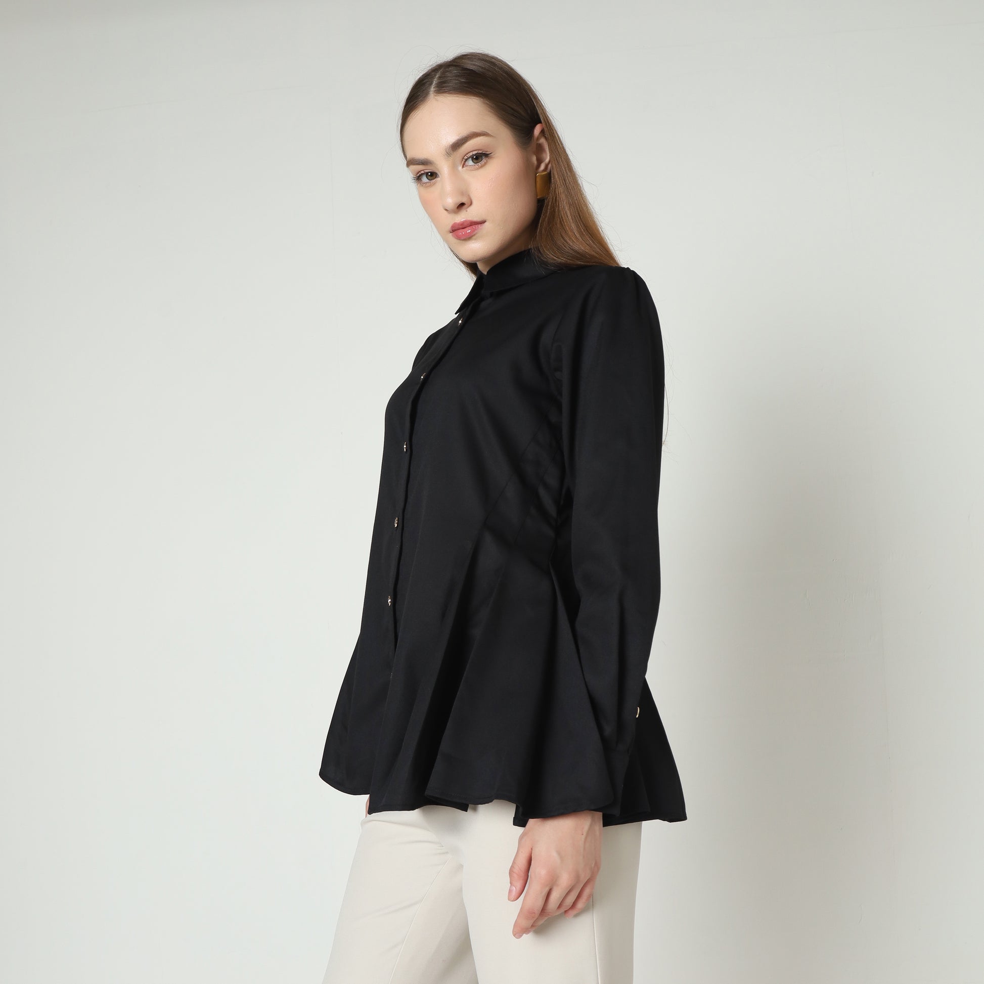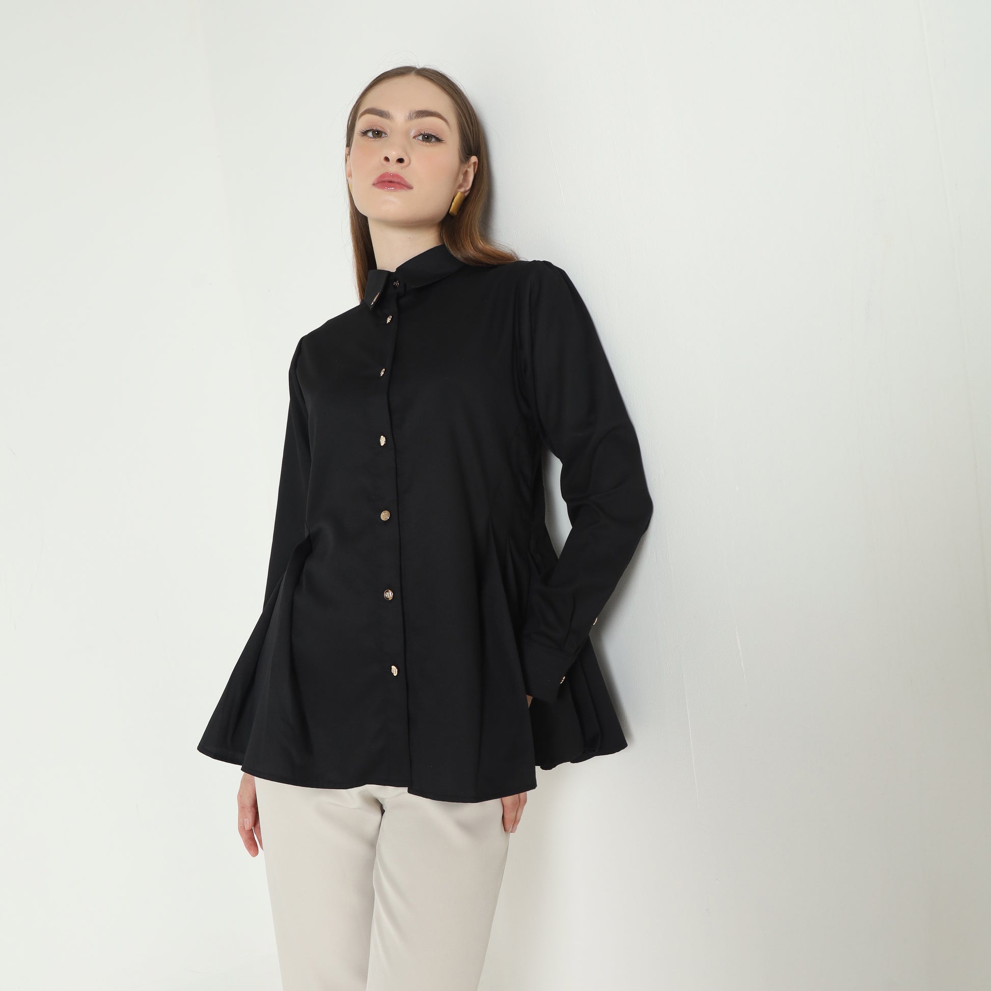 Discover refined elegance with the Hanika Shirt, a beautifully crafted piece that combines classic tailoring with subtle modern details. Made from high-quality fabric, this shirt features a timeless collared design accentuated by delicate gold buttons that add a touch of sophistication. The softly gathered and pleated details along the sides and cuffs create a graceful silhouette, perfect for elevating both professional and elegant casual ensembles. Whether styled with tailored trousers or a chic skirt, the Hanika Shirt embodies effortless luxury and timeless style.