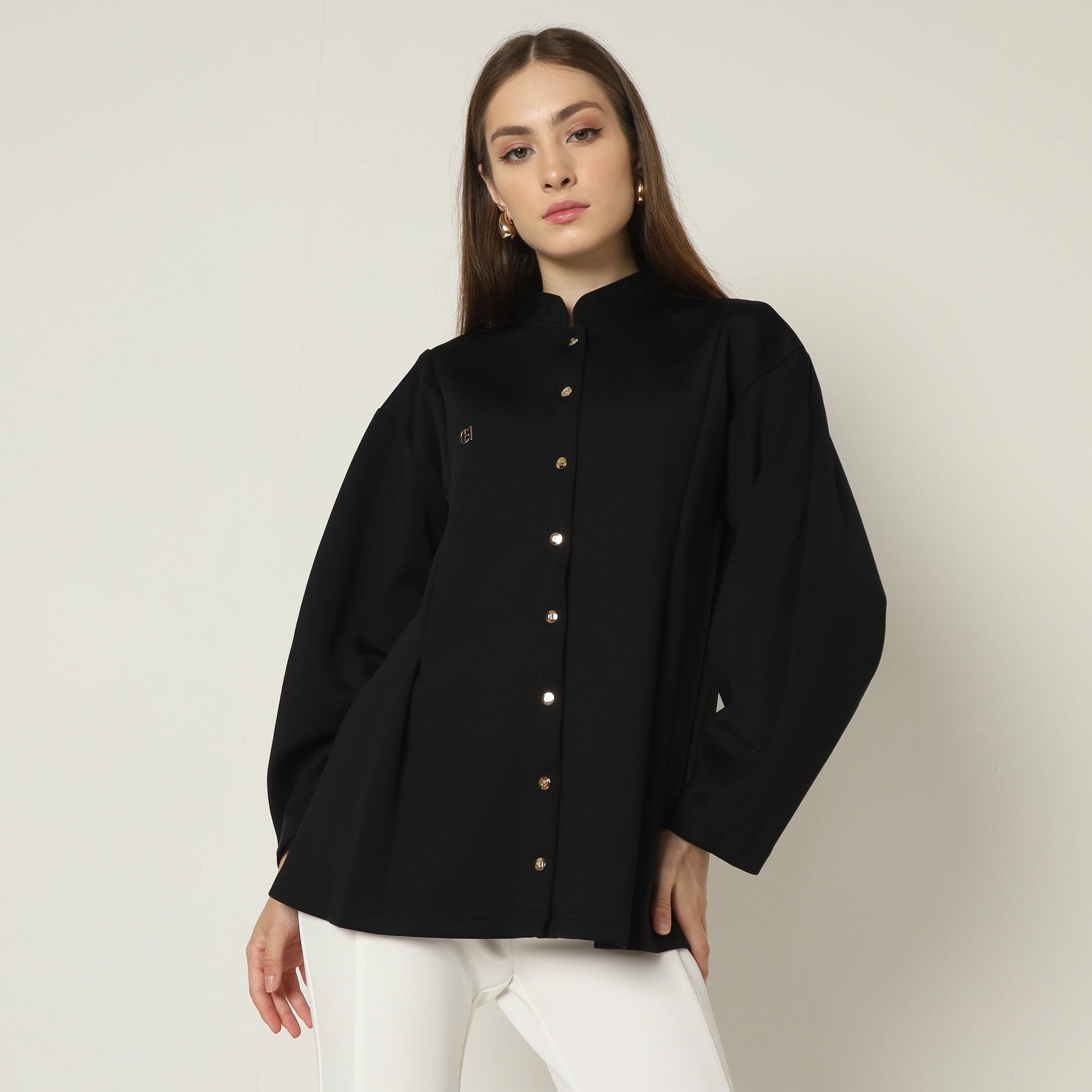 Harmoni Blouse exudes refined elegance through its contemporary design and sophisticated detailing. Crafted from luxurious fabric, it features a sleek, stand collar and a row of delicate metallic buttons that add a subtle touch of brilliance. The voluminous balloon sleeves create a balanced silhouette of modern femininity, while the tailored fit ensures versatility for both professional and polished casual looks. With its understated yet striking presence, it effortlessly elevates any wardrobe, embodying effortless style and timeless grace for the modern wardrobe.