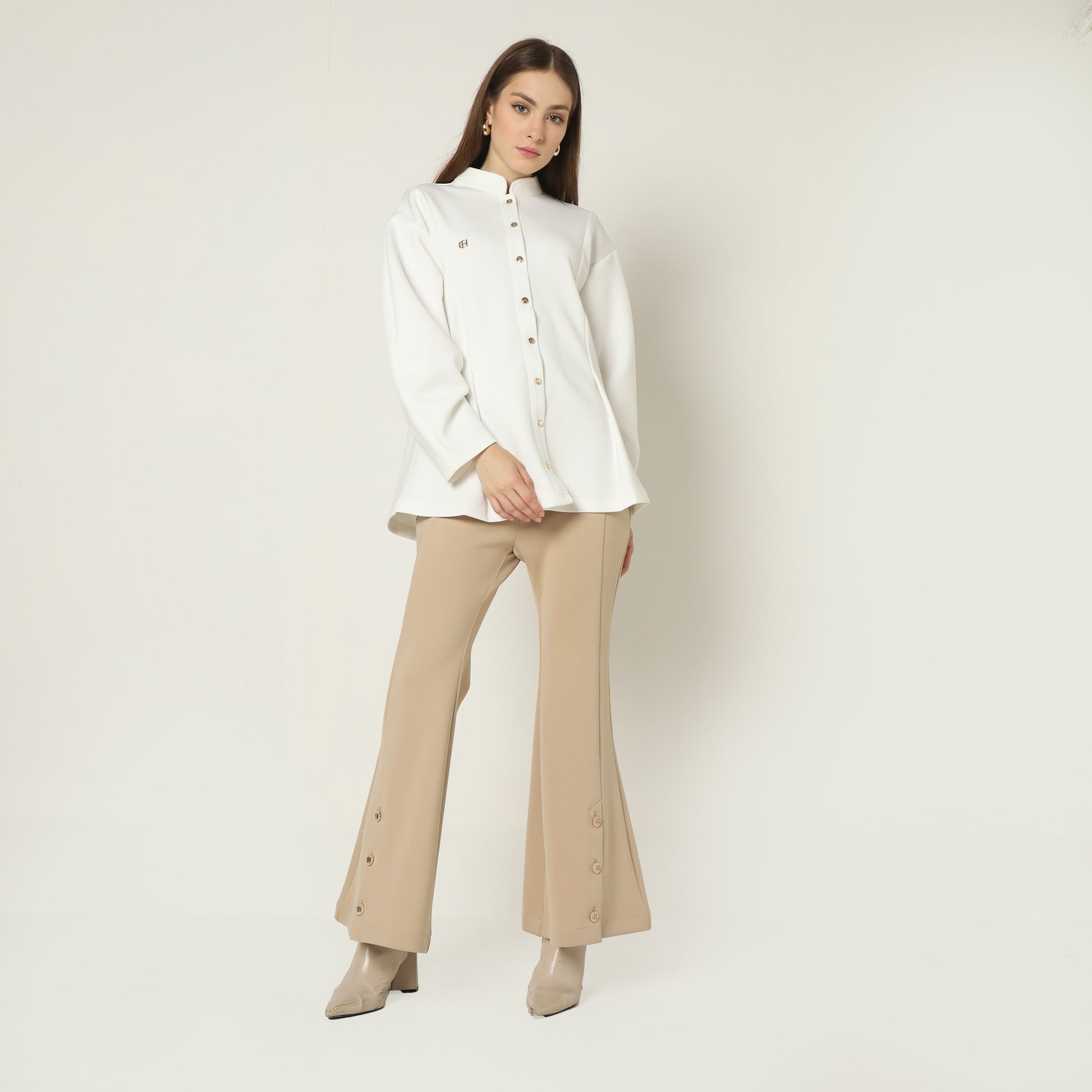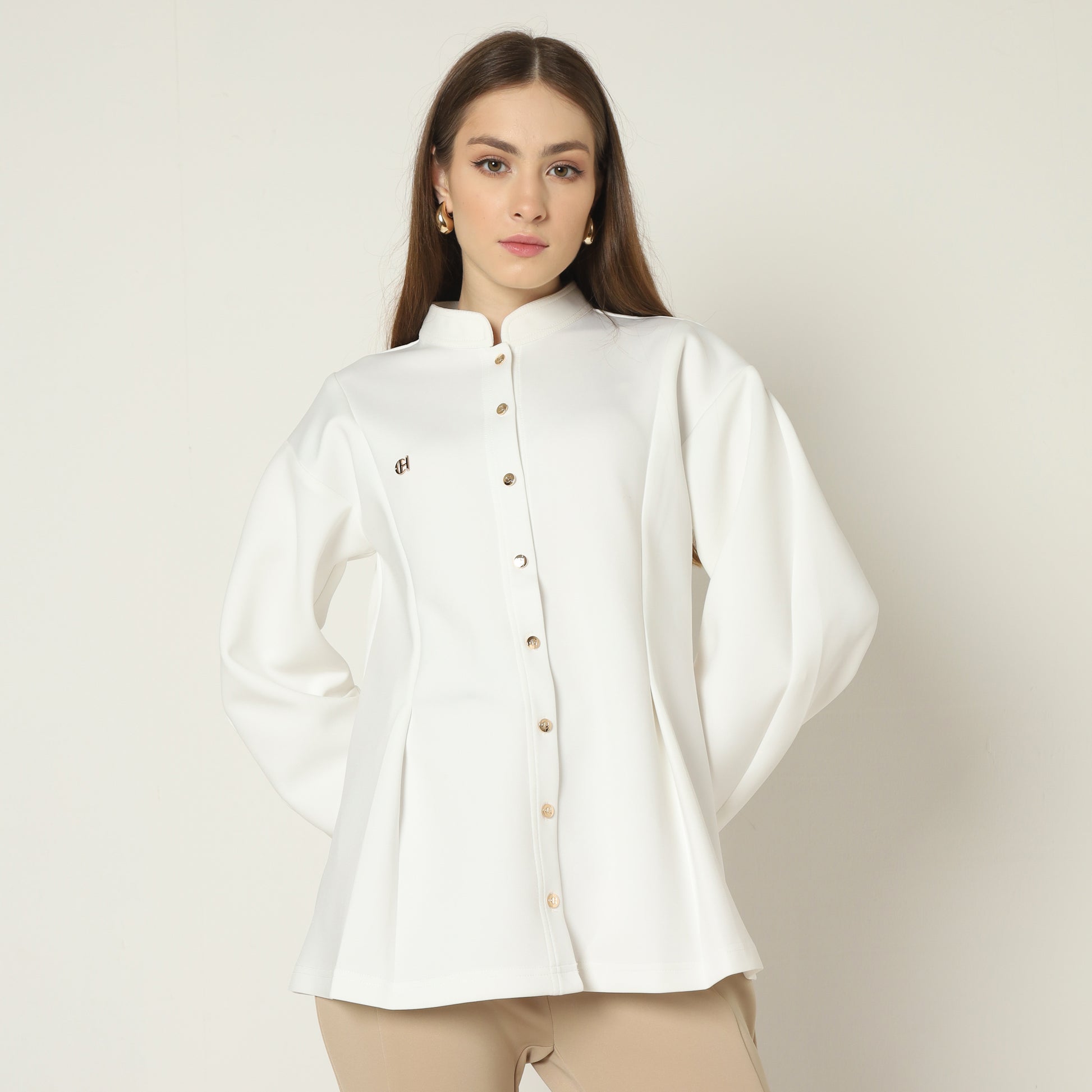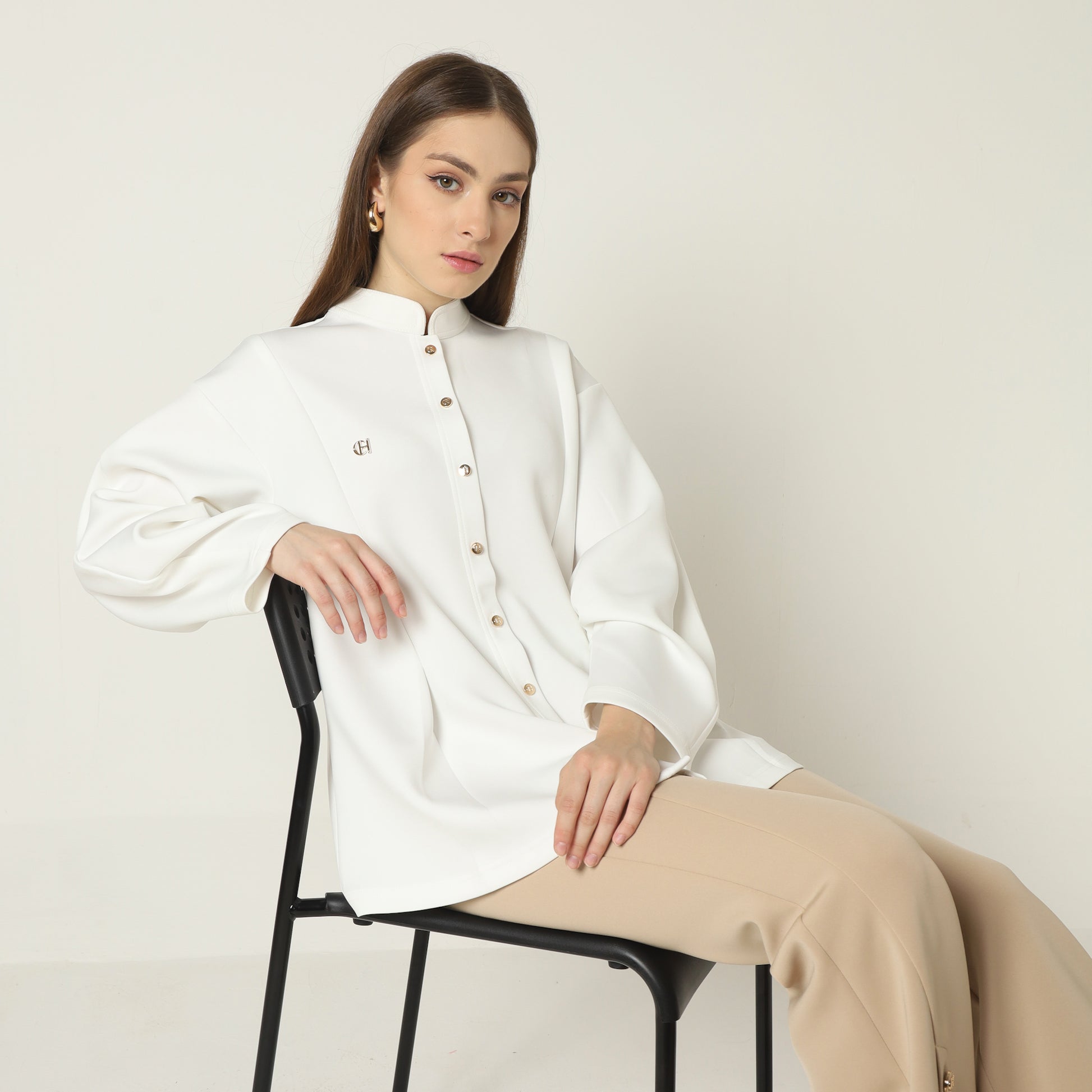 Harmoni Blouse exudes refined elegance through its contemporary design and sophisticated detailing. Crafted from luxurious fabric, it features a sleek, stand collar and a row of delicate metallic buttons that add a subtle touch of brilliance. The voluminous balloon sleeves create a balanced silhouette of modern femininity, while the tailored fit ensures versatility for both professional and polished casual looks. With its understated yet striking presence, it effortlessly elevates any wardrobe, embodying effortless style and timeless grace for the modern wardrobe.
