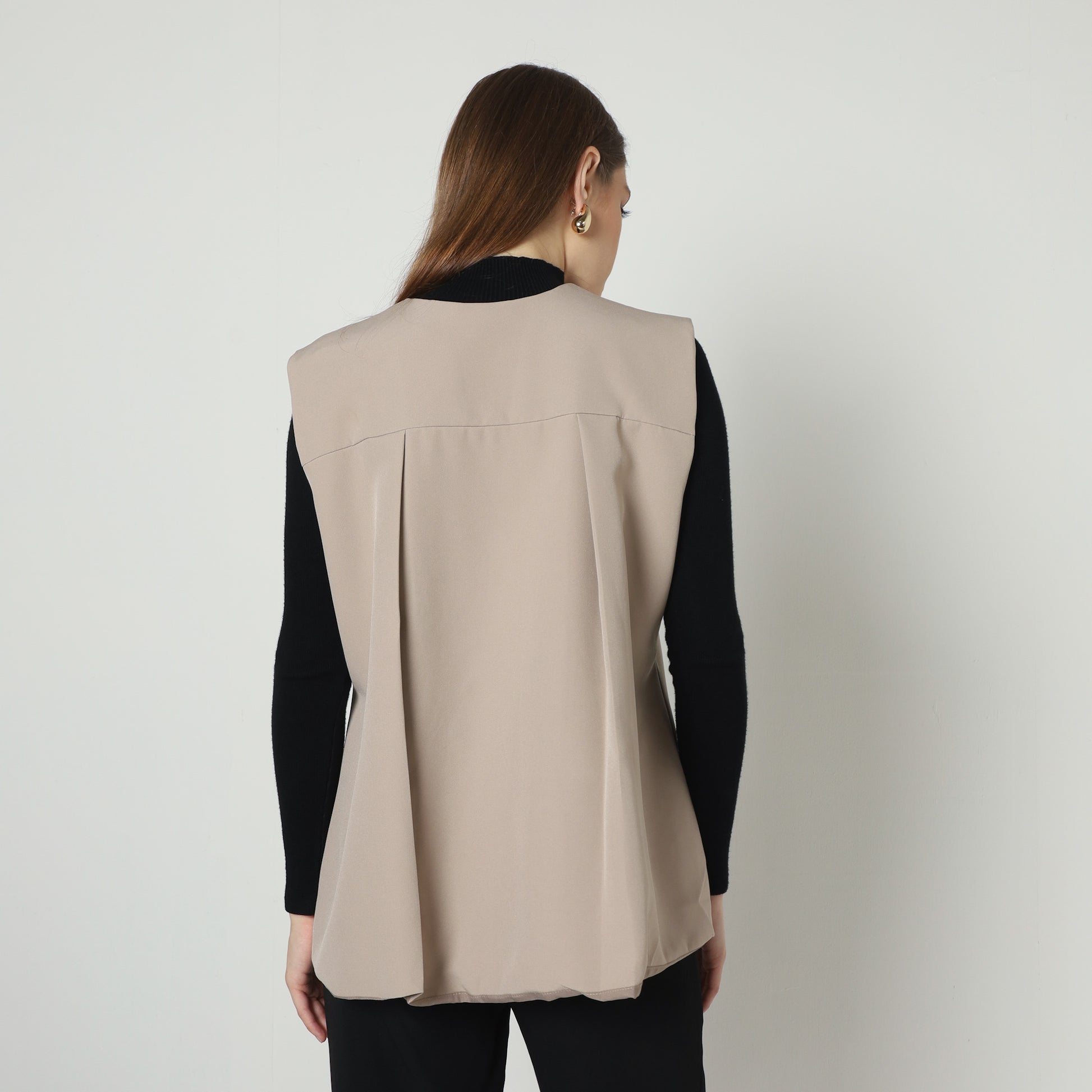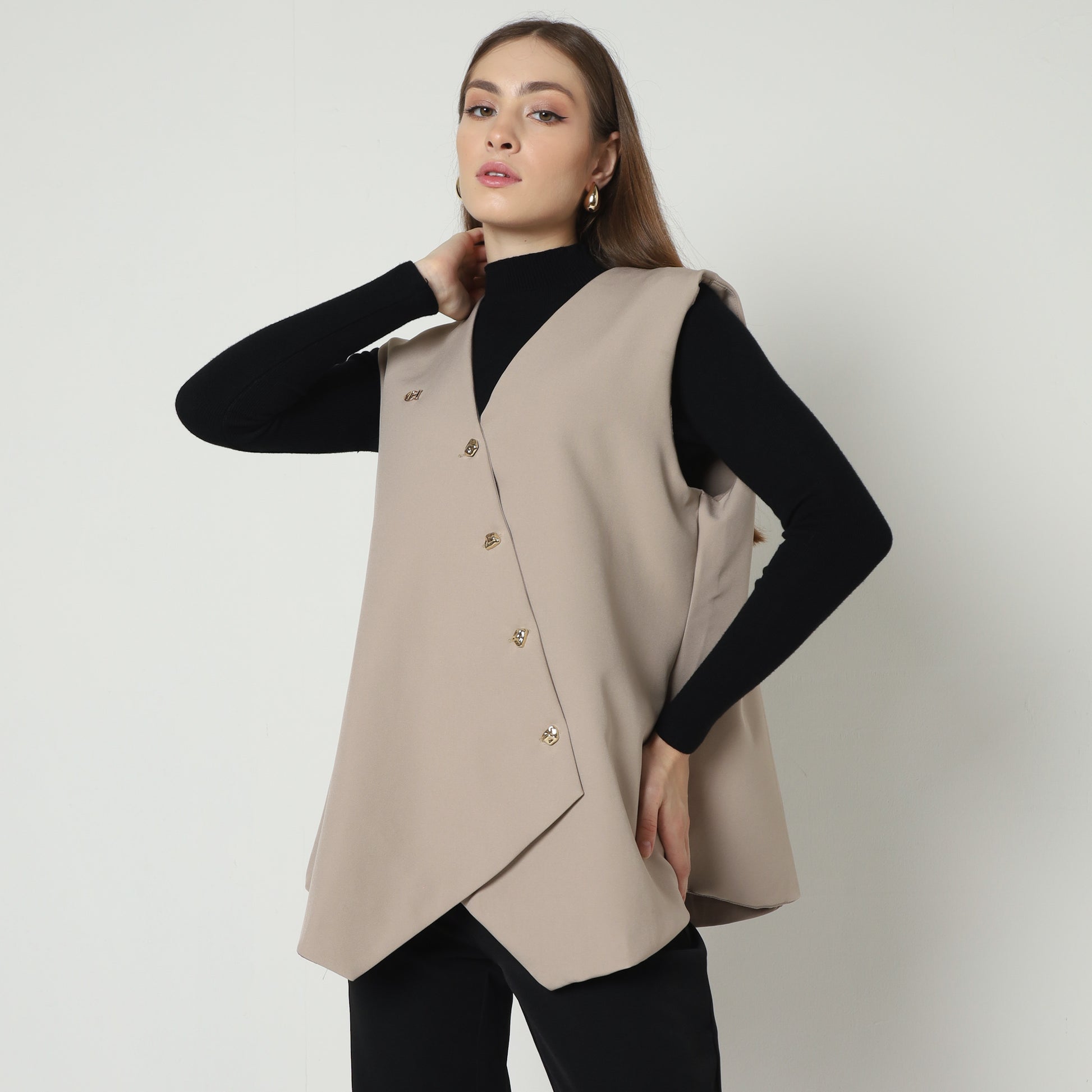 Iara Vest embodies modern sophistication with its clean lines and layered asymmetry, offering a versatile piece that effortlessly elevates any ensemble. Crafted from plush, finely textured fabric, it features a sleek, sleeveless silhouette accented by a subtle row of metallic buttons that create a refined focal point. Its thoughtfully draped design offers a flattering fit while embracing contemporary fashion sensibilities. Perfect for layering over polished blouses or turtlenecks, it adds a touch of understated elegance and effortless style to both professional and casual looks, making it a timeless addition to any wardrobe.