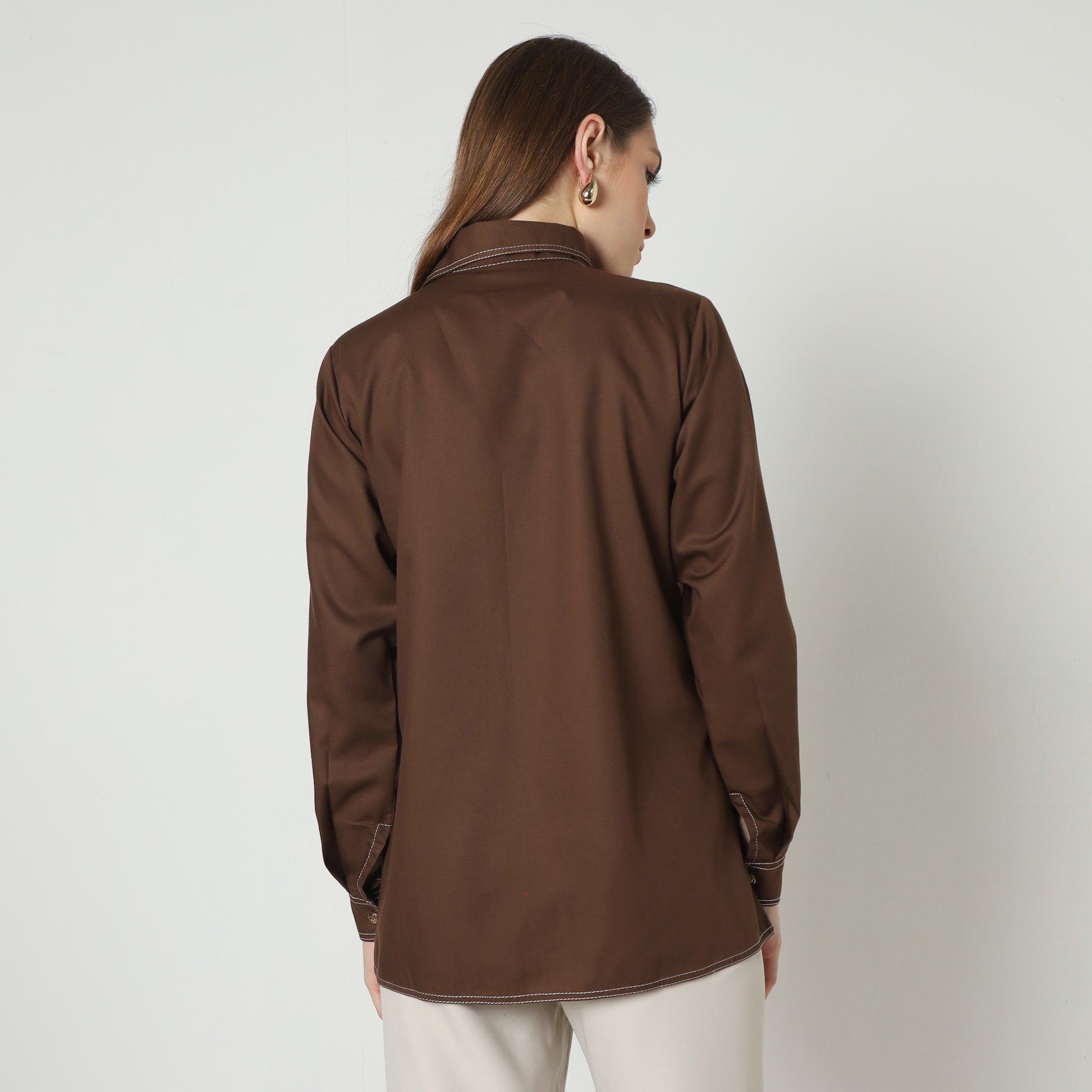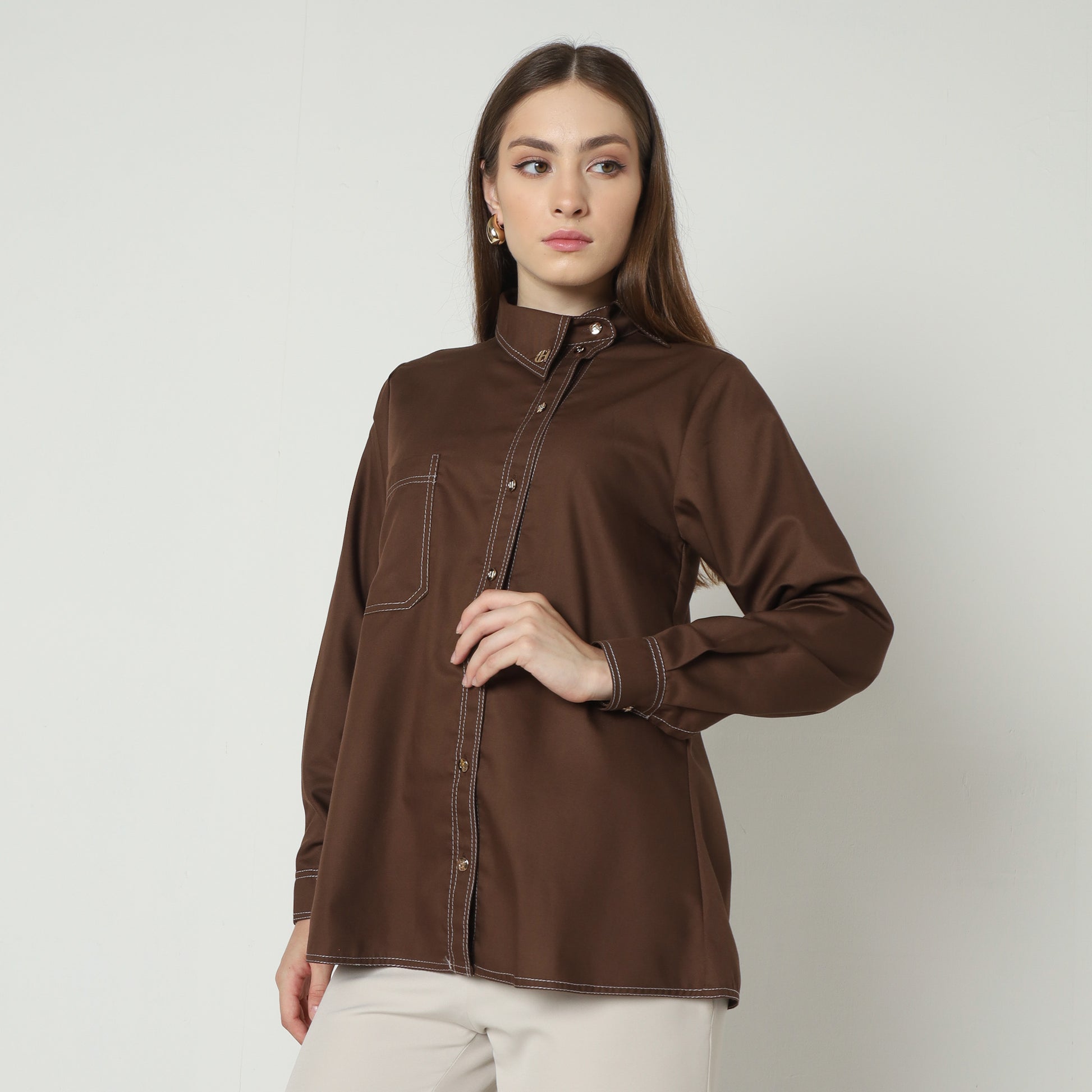 Ivanka Shirt exemplifies timeless elegance with its refined silhouette and meticulous craftsmanship. Made from rich, luxurious fabric, it features a classic stand collar embellished with delicate tonal embroidery, adding subtle sophistication. The front is gracefully adorned with a row of lustrous buttons that extend seamlessly from the collar to the hem, while the softly contoured fit offers both comfort and polish. Elegant yet versatile, it elevates any ensemble, whether paired with tailored trousers for a professional look or styled casually for a chic day out, embodying understated luxury and impeccable style.
