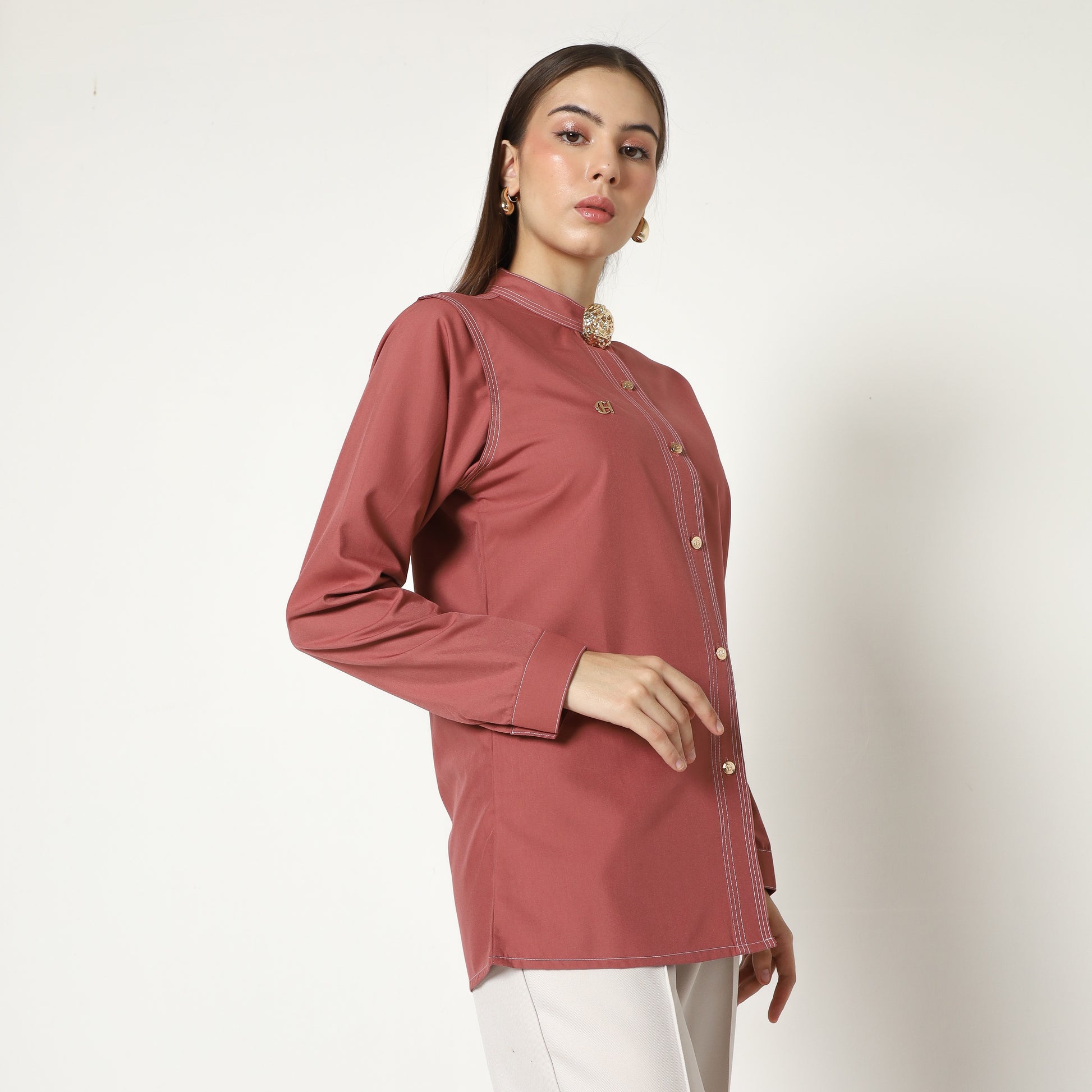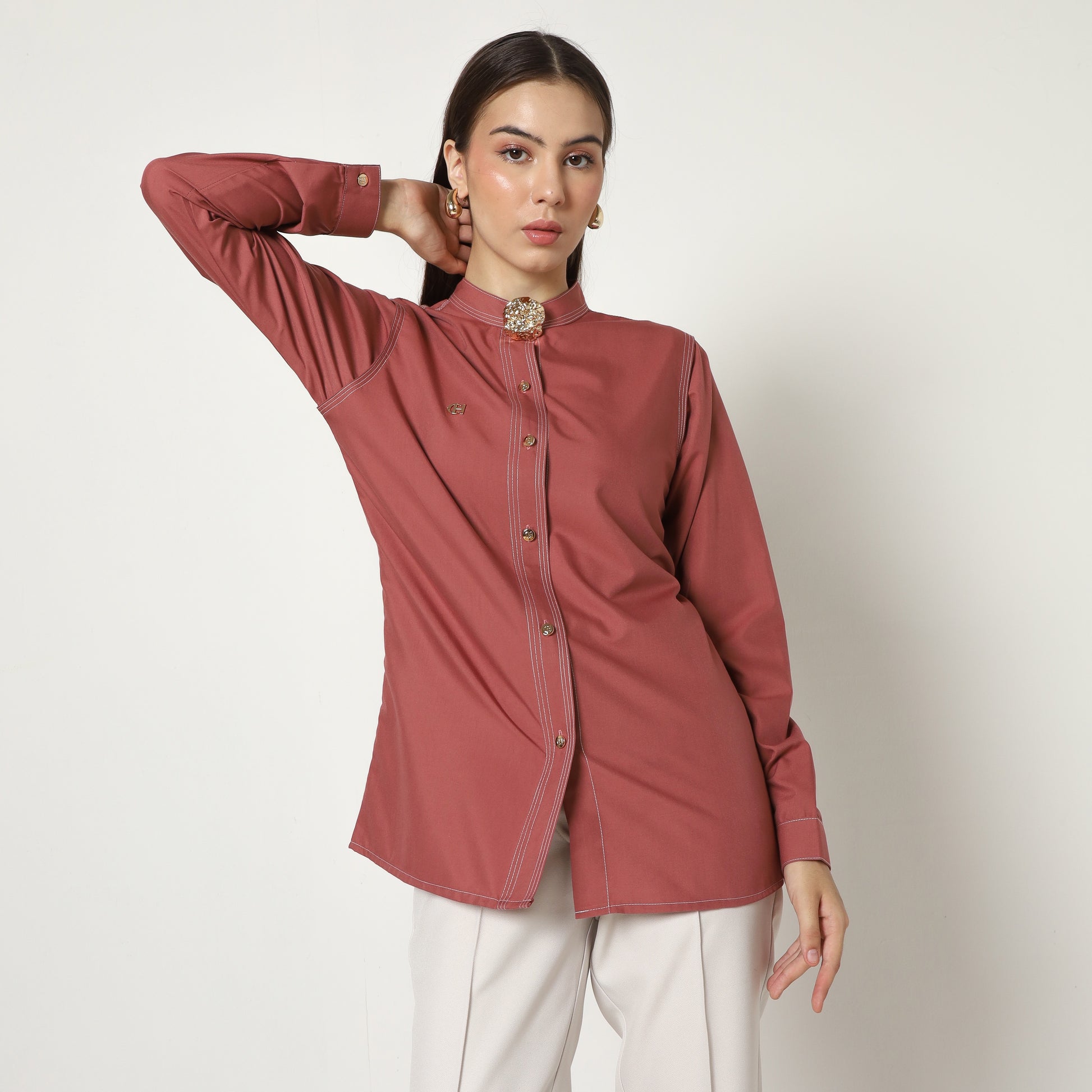 Crafted from high-quality fabric, Macy Shirt features a refined stand collar adorned with a delicate decorative brooch, adding a touch of understated luxury. The tailored silhouette is enhanced by a sleek, vertical button placket that elongates the figure, while subtle piping detail along the shoulders and sides offers a modern twist. Versatile and effortlessly chic, Macy Shirt is perfect for elevating both professional ensembles and stylish casual looks, embodying an impeccable balance of classic style and contemporary refinement.
