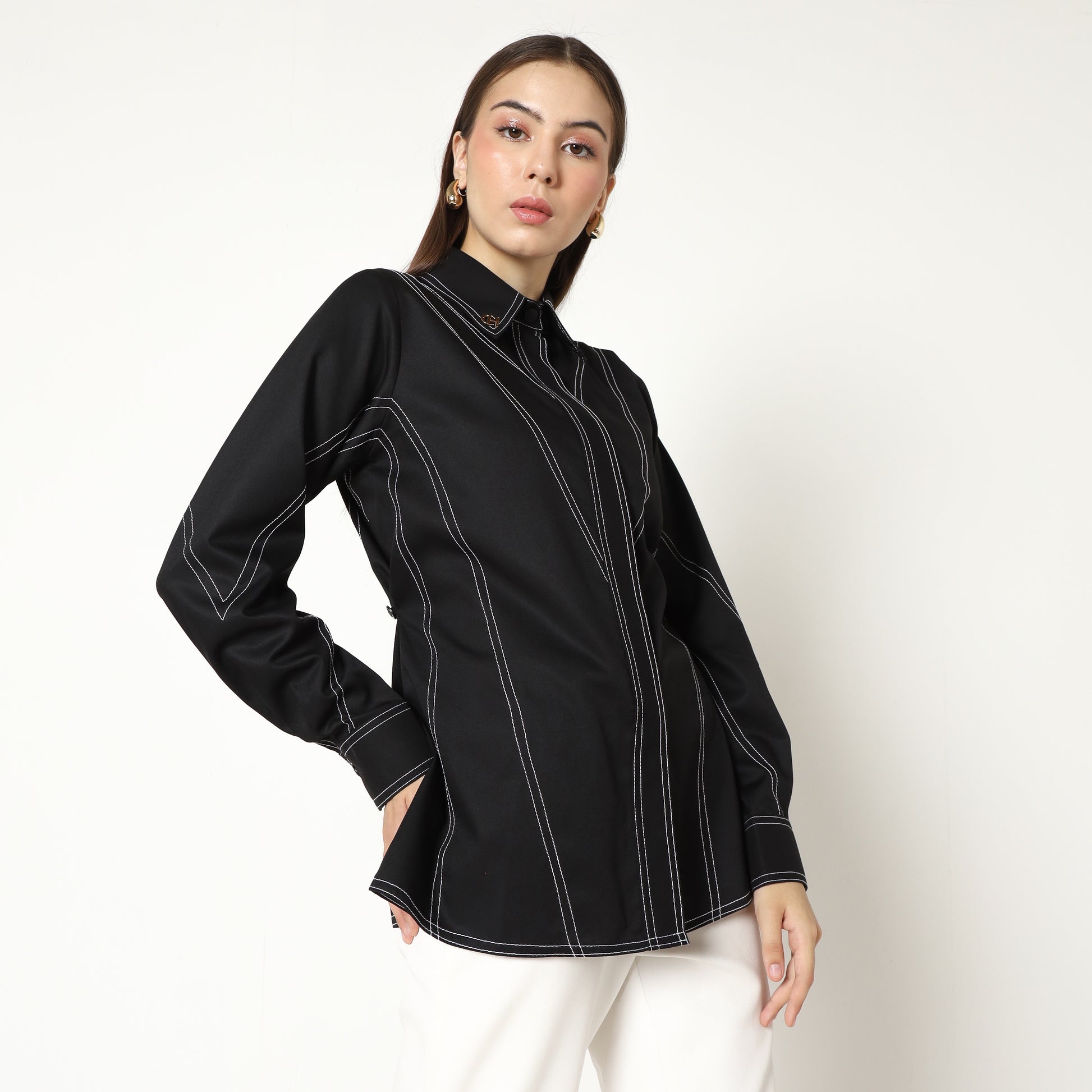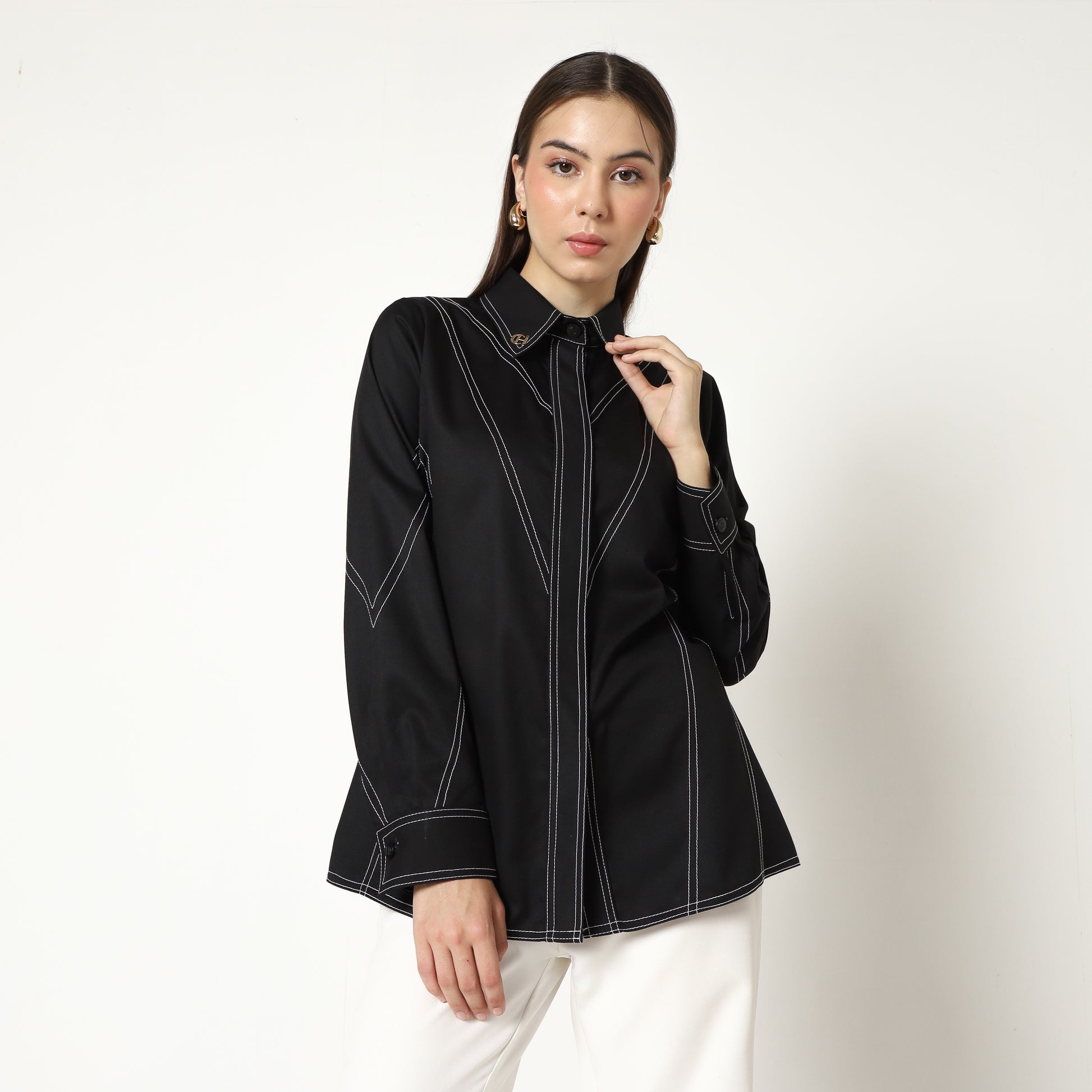 Crafted from luxurious fabric, Margo Shirt features a classic pointed collar and a concealed front placket, offering a refined and polished appearance. The unique geometric embroidery that traces the entire shirt adds a striking visual element, creating a perfect harmony of modern design and timeless style. Its tailored fit ensures comfort and versatility, making Margo Shirt an essential piece that seamlessly transitions from professional refinement to chic casual elegance with effortless grace.