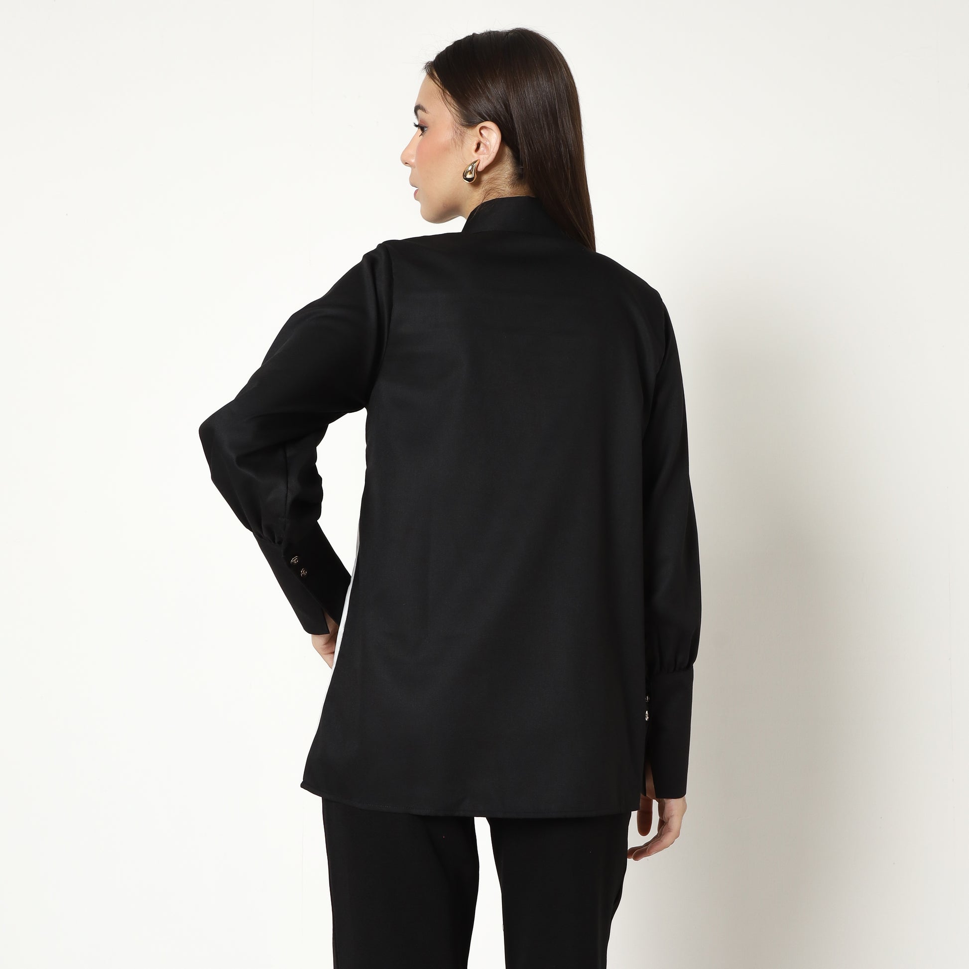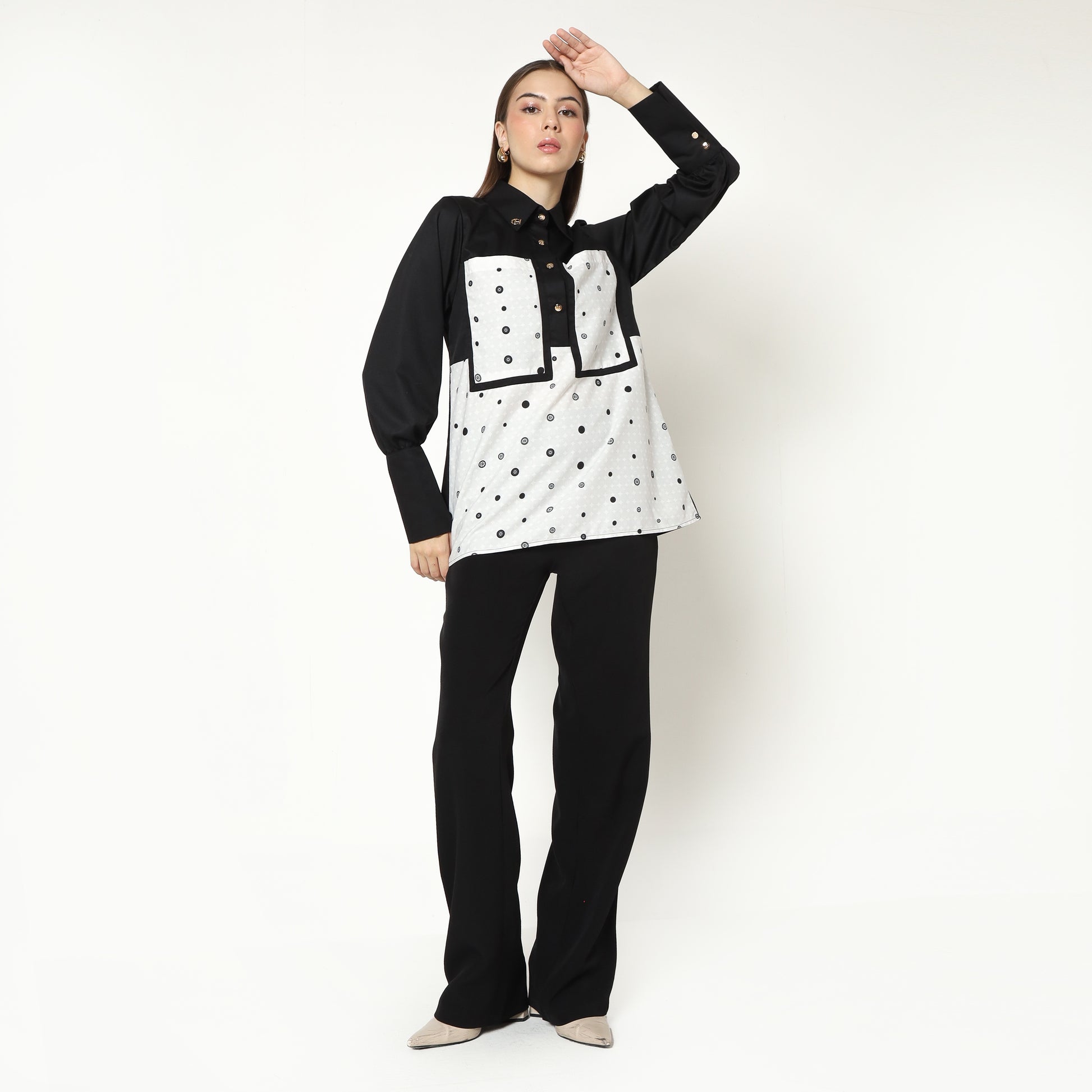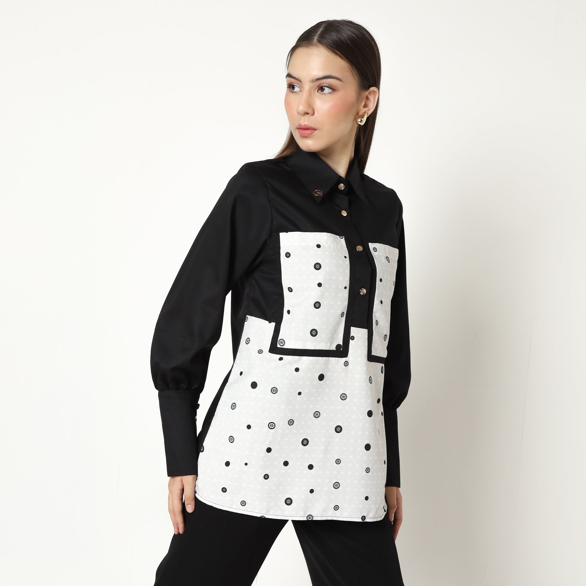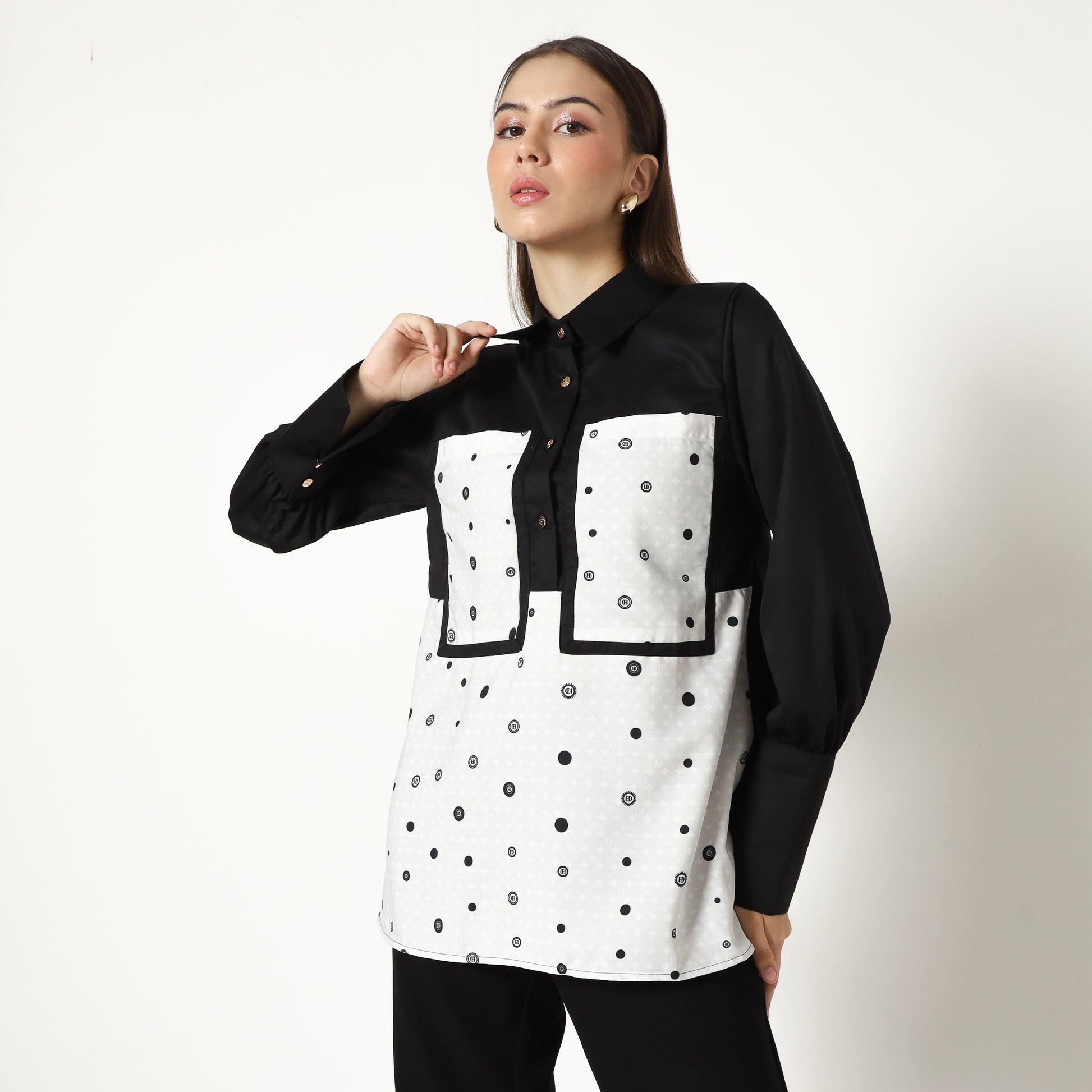 Crafted from high-quality fabric, Marin Shirt captures a perfect balance of playful sophistication and timeless elegance.. Featuring a classic collared design complemented by a unique color-blocked pattern that artfully combines contrasting polka-dot details with sleek, solid panels. Its relaxed yet refined silhouette is accented with subtle gold button details, adding a touch of luxe charm. Versatile and stylish, Marin Shirt is ideal for both polished professional settings and chic casual outings, transforming any outfit with its distinctive design and effortless grace.