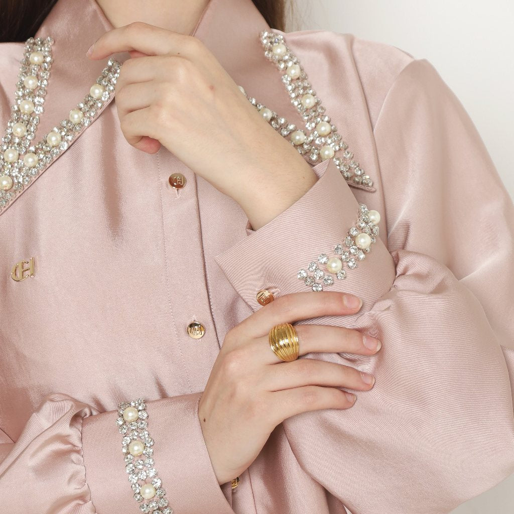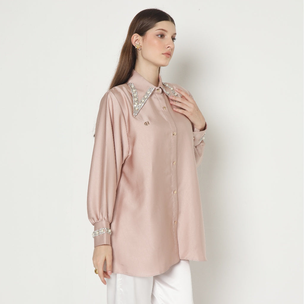 The Moira Shirt exudes sophistication with its elegant silhouette and intricate embellishments. Crafted from a luxurious, silky fabric, it features delicate pearl and bead details along the collar and cuffs, adding a touch of opulent charm. The classic button-down design is elevated by subtle draping and a tailored fit, making it perfect for both formal and chic casual occasions. With its refined details and timeless allure, the Moira Shirt effortlessly embodies understated luxury and contemporary elegance, making it a versatile staple for any sophisticated wardrobe.