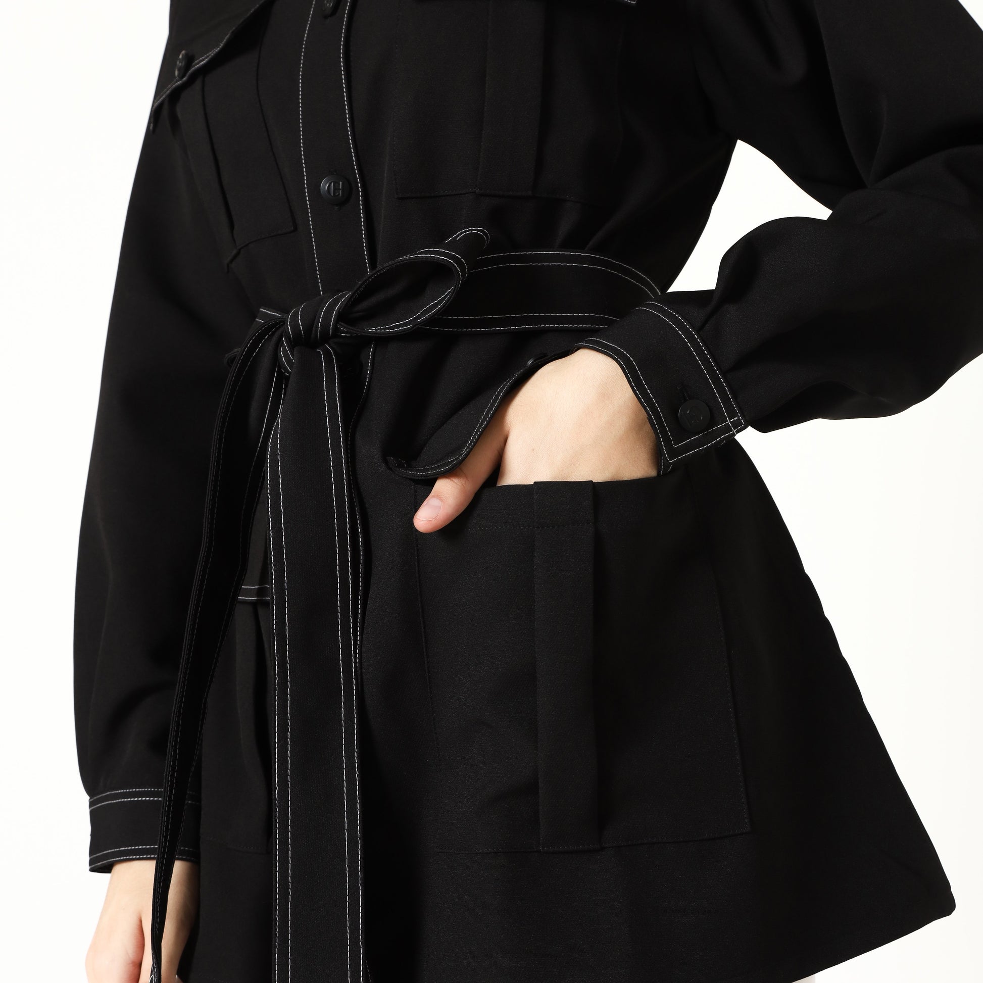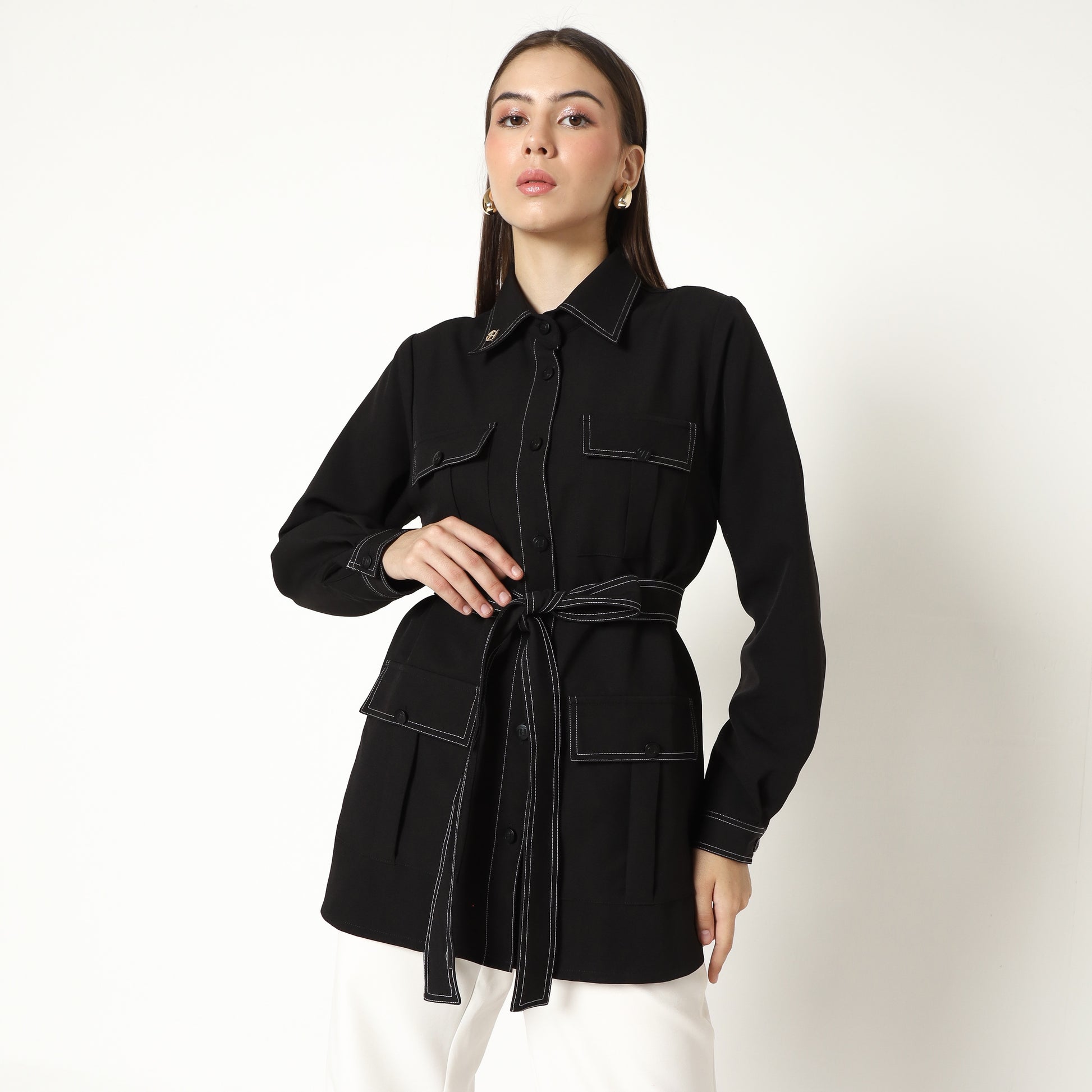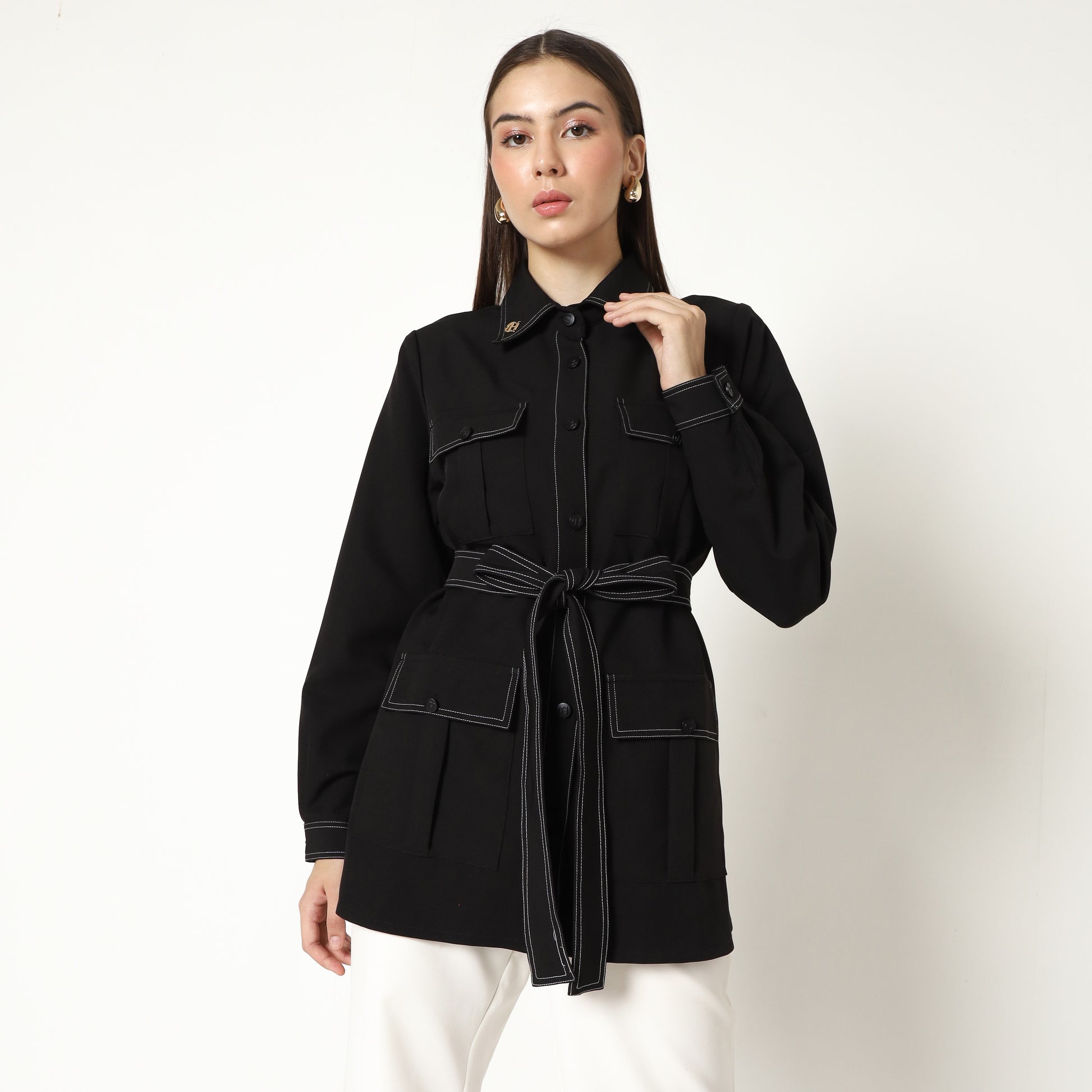 Crafted from high-quality fabric, Mona Shirt features a classic shirt collar and button-down front accented with subtle, elegant stitching that highlights its luxurious craftsmanship. The belted waist adds a flattering, feminine touch, allowing for versatile styling options from polished to casual chic. Complete with thoughtfully designed pockets and contrasting trim details, Mona Shirt seamlessly blends classic elegance with contemporary flair, making it a versatile wardrobe essential for elevating any ensemble with effortless grace.