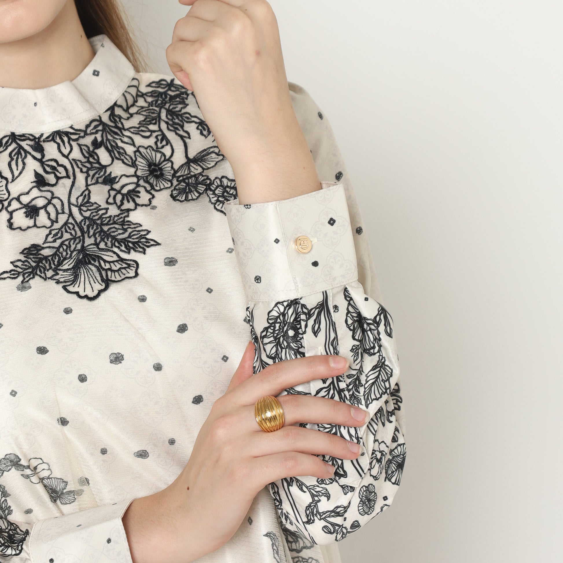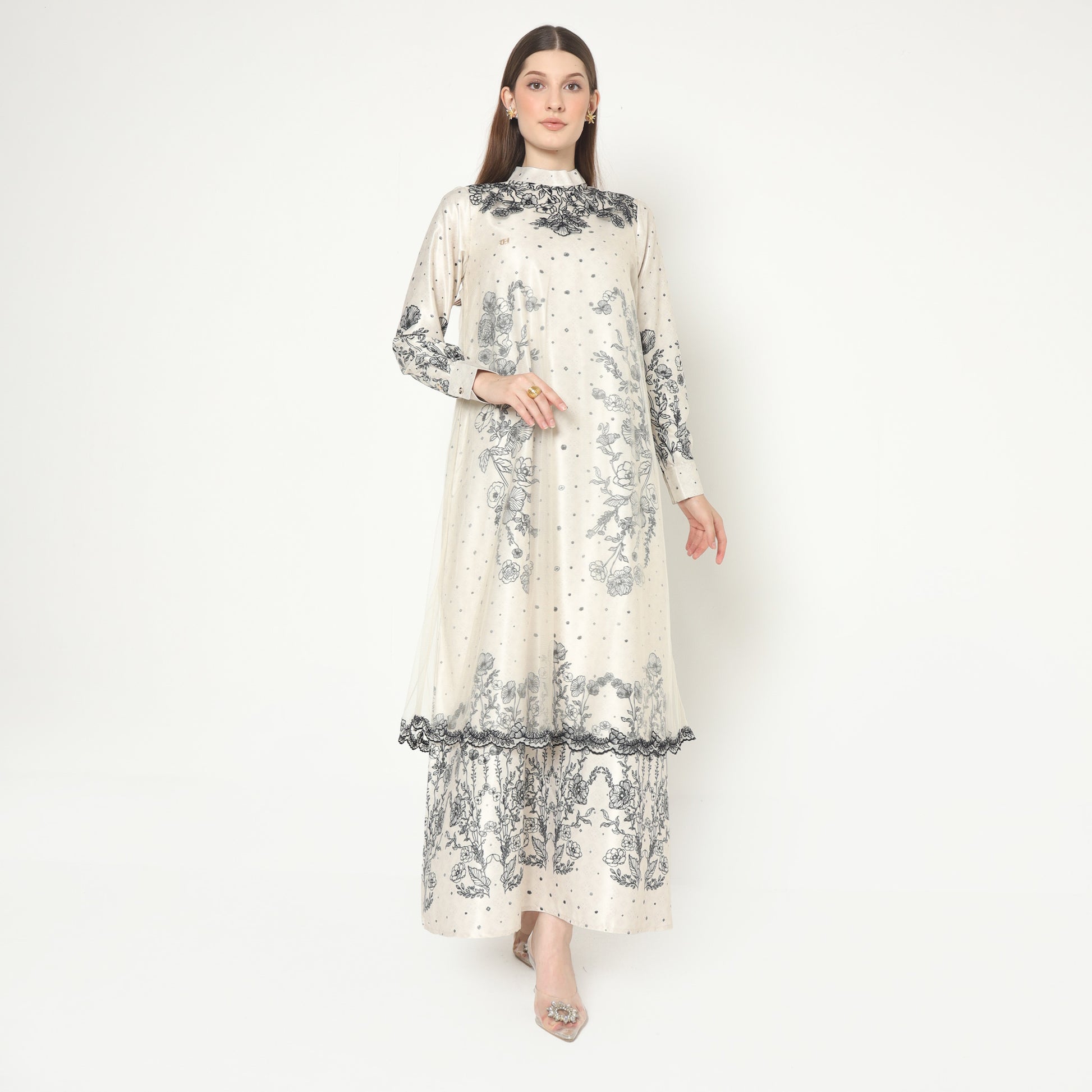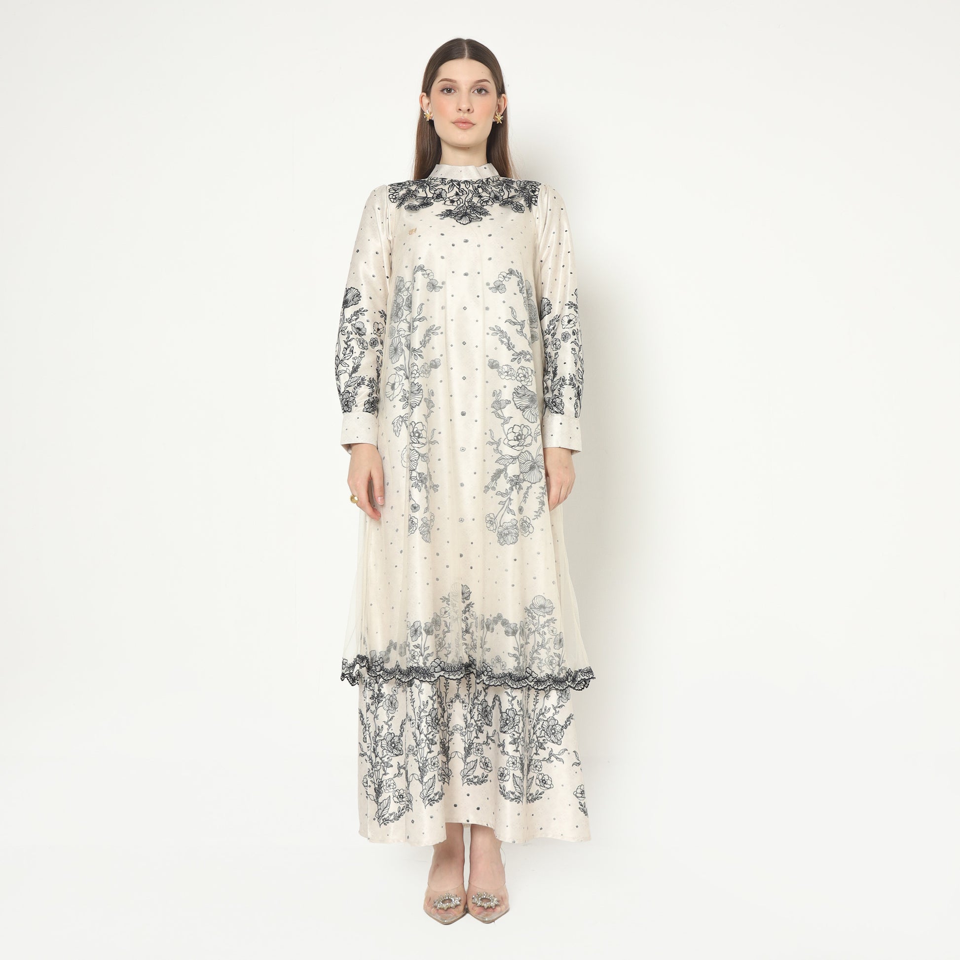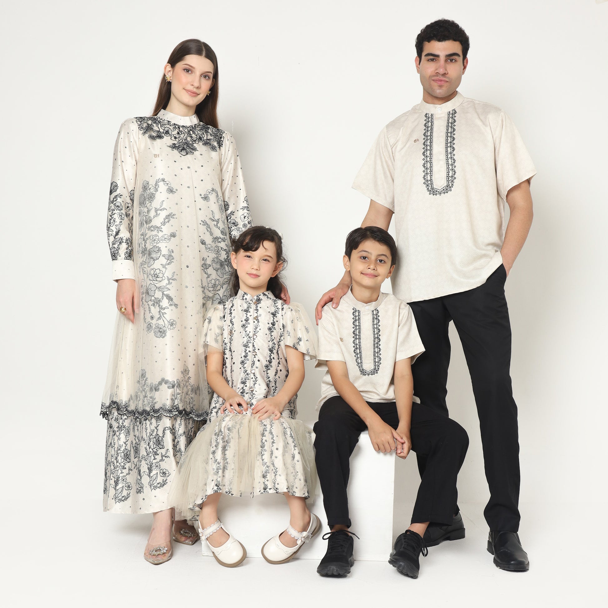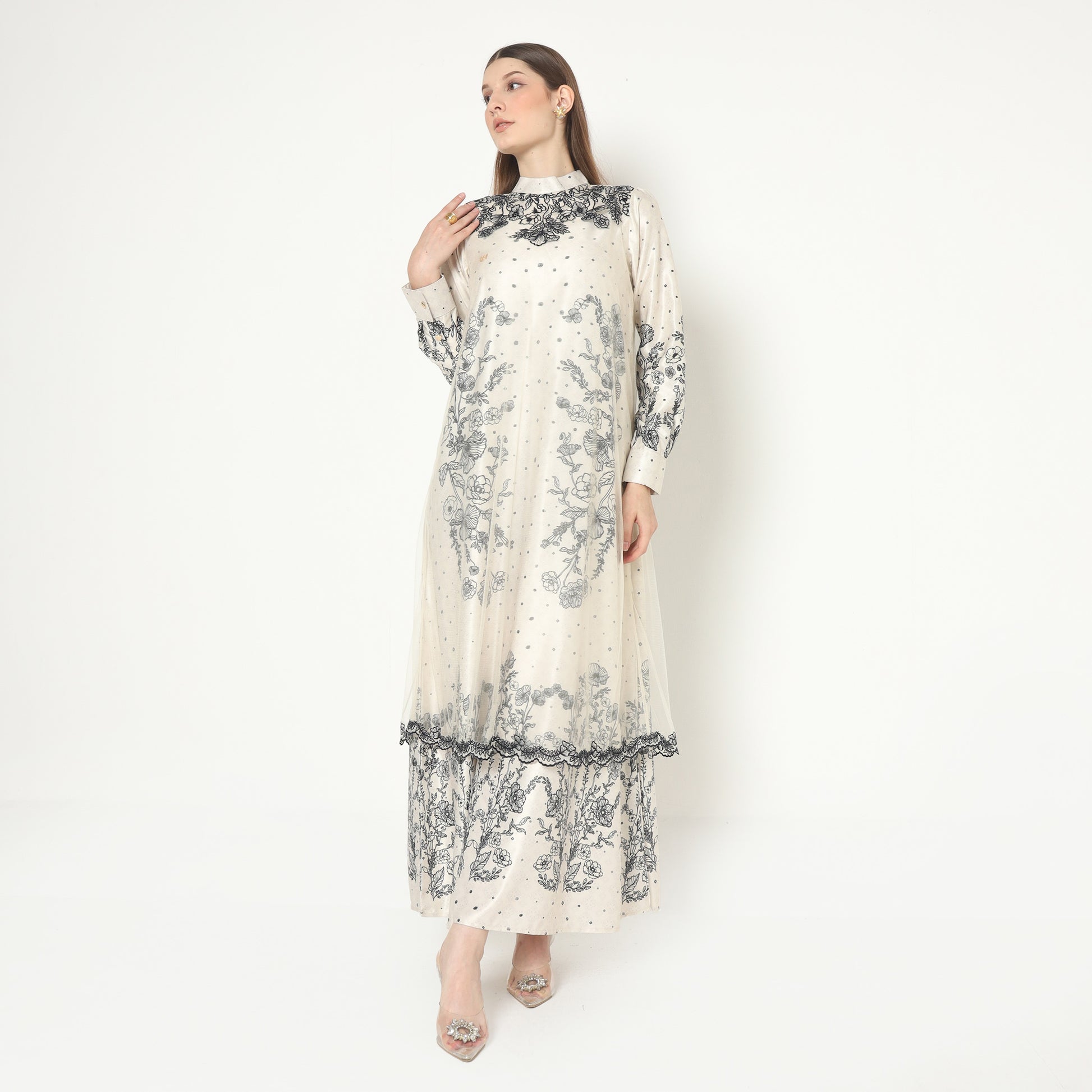 The Nahla Dress embodies timeless elegance with its flowing silhouette and intricate detailing. Crafted from luxurious, delicately embroidered fabric, it features a harmonious blend of subtle tones and ornate lace accents, creating a sophisticated and graceful appearance. The high neckline and long sleeves enhance its refined charm, while the layered design adds depth and movement. Perfect for both formal occasions and cultural festivities, the Nahla Dress exudes understated luxury, making it a stunning statement of classic beauty.