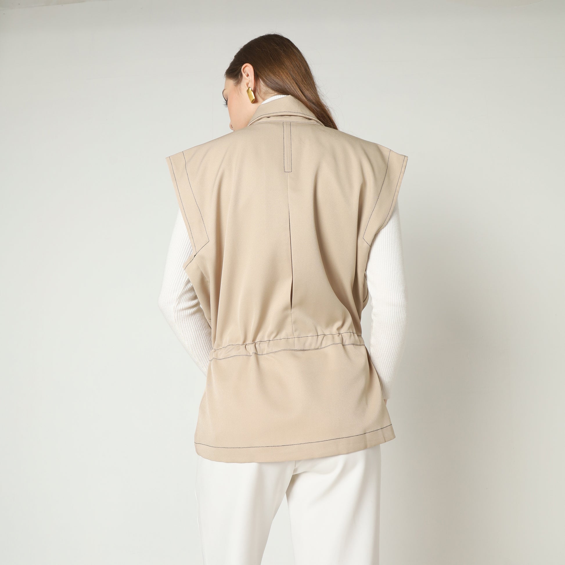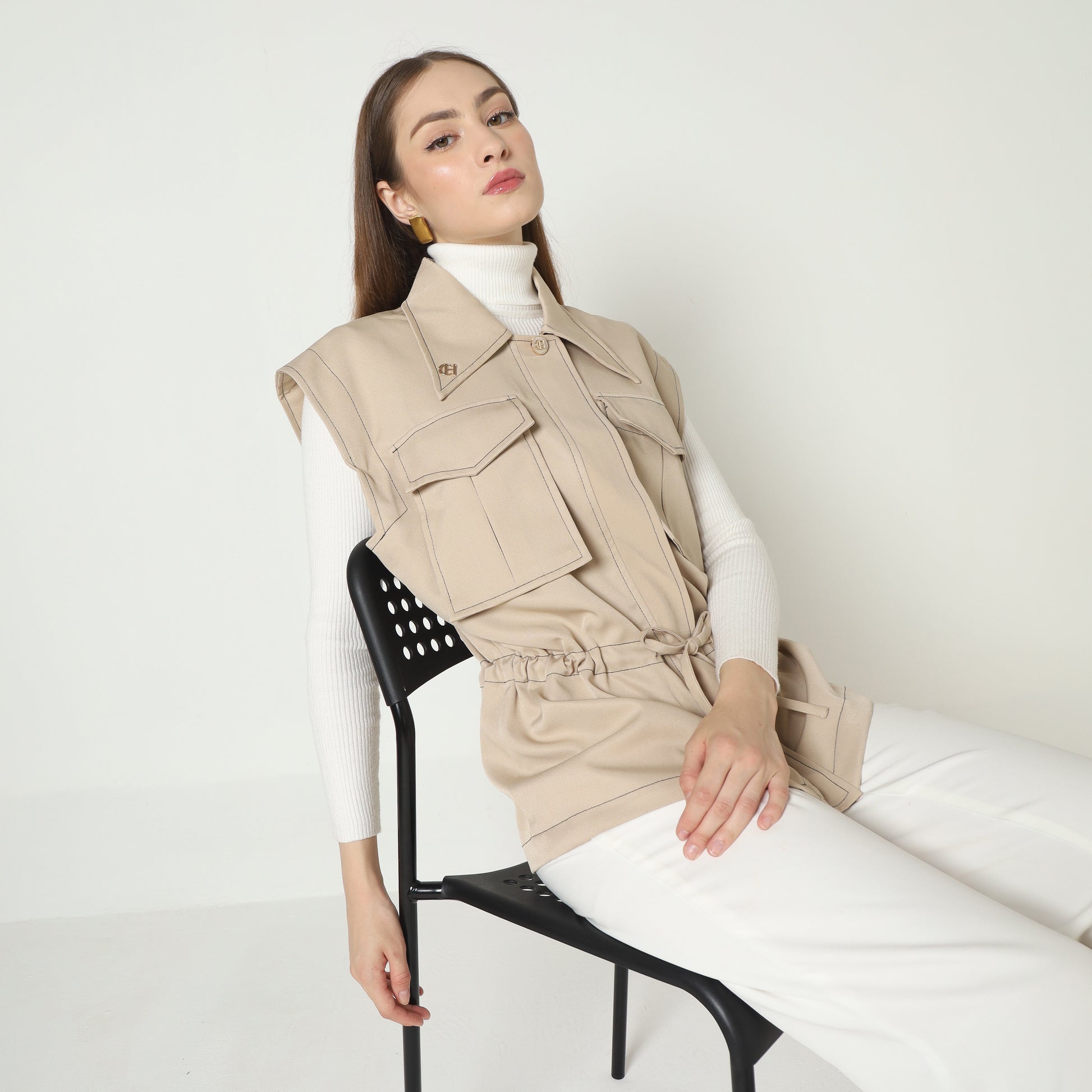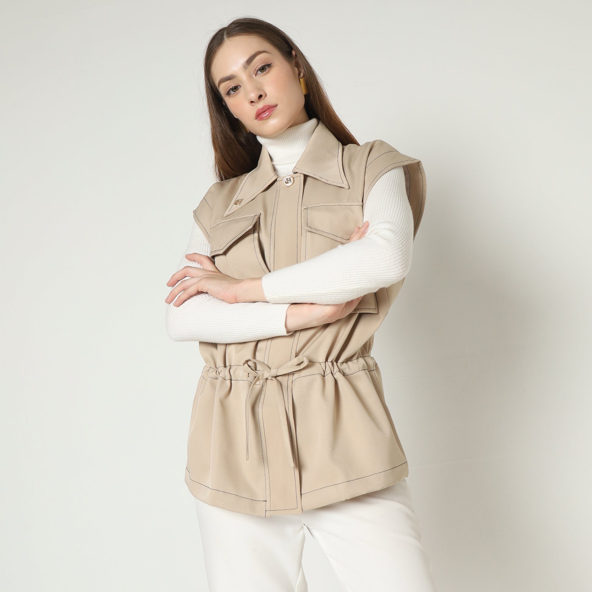Introducing the Nou Abrielle Vest, a sophisticated layering piece crafted from luxurious, impeccably tailored fabric that exudes modern elegance. Featuring a sleek, structured silhouette adorned with functional flap pockets and subtle contrasting stitching, this vest elevates any ensemble with its refined details. The adjustable drawstring waist adds a touch of versatility, allowing for a perfect fit that accentuates your silhouette. Whether styled over a crisp blouse or a chic dress, the Nou Abrielle Vest is a statement of understated luxury, designed to elevate your wardrobe with timeless charm and contemporary flair.
