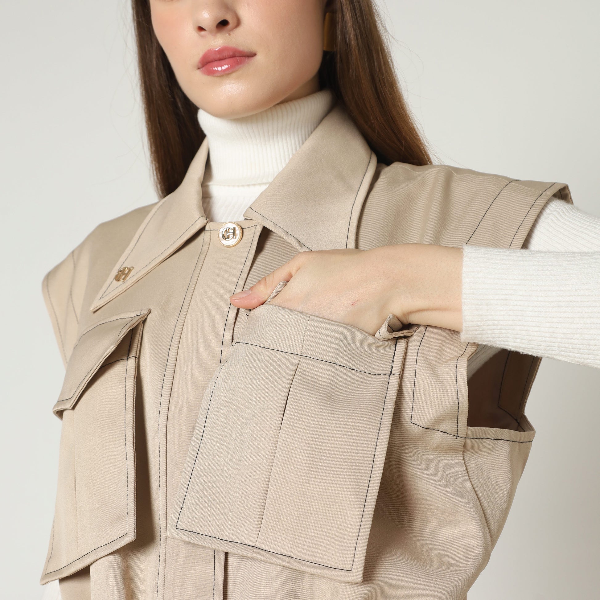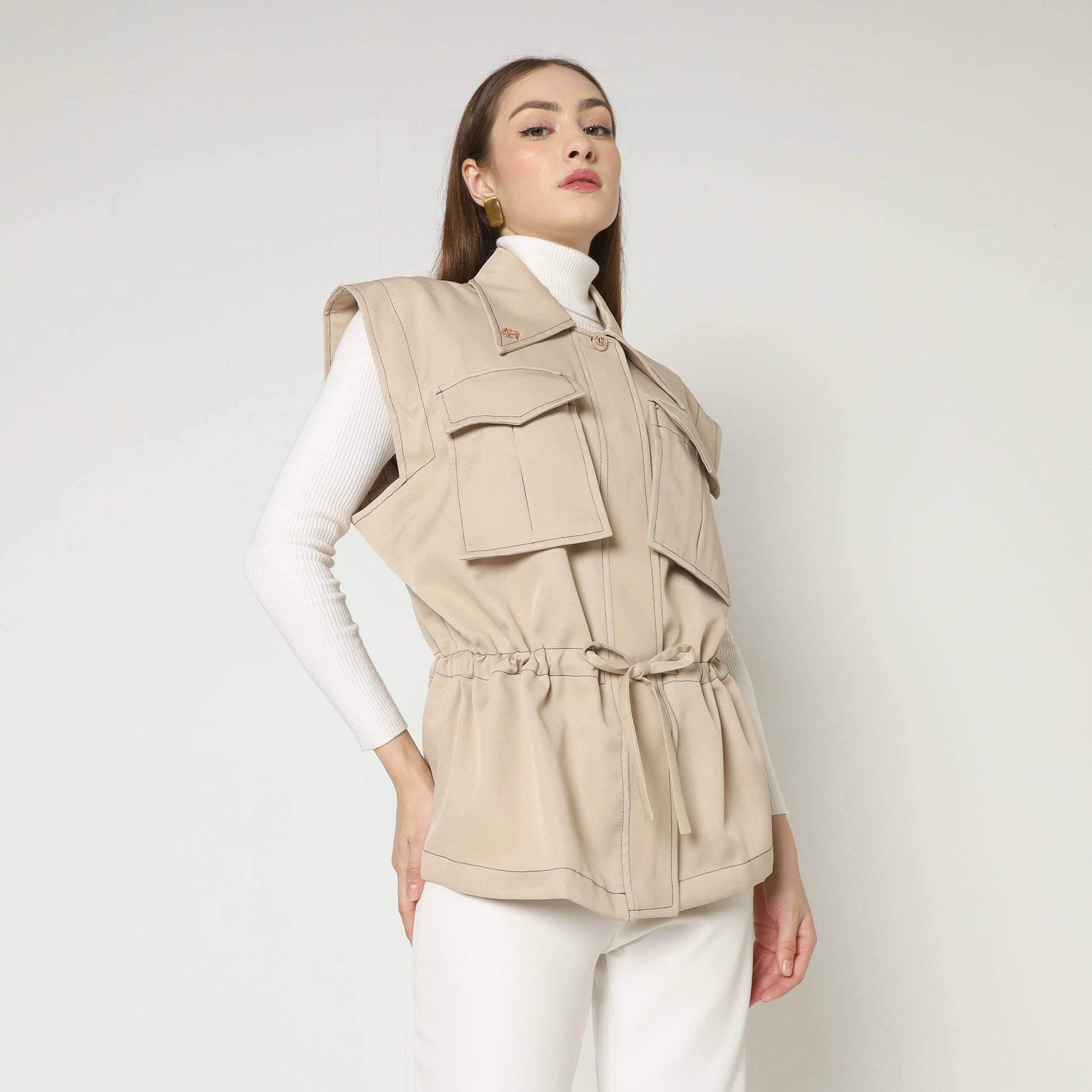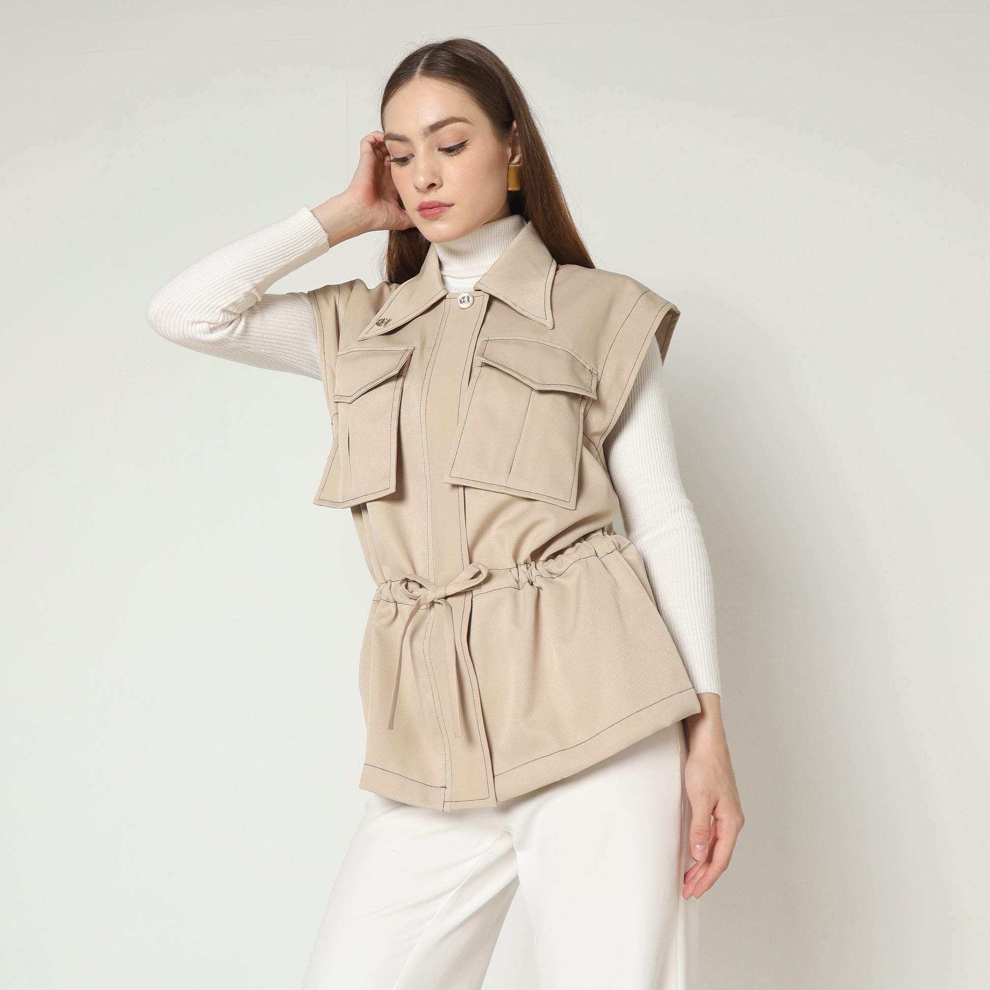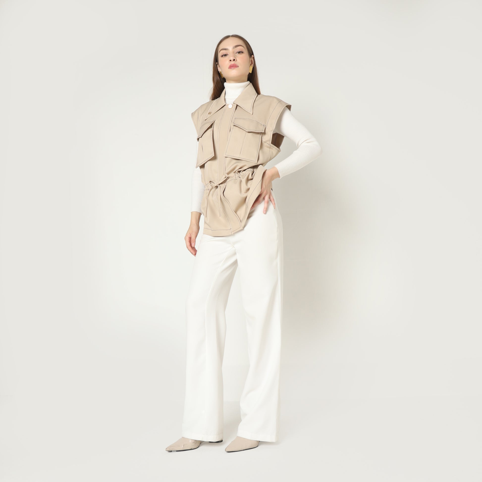 Introducing the Nou Abrielle Vest, a sophisticated layering piece crafted from luxurious, impeccably tailored fabric that exudes modern elegance. Featuring a sleek, structured silhouette adorned with functional flap pockets and subtle contrasting stitching, this vest elevates any ensemble with its refined details. The adjustable drawstring waist adds a touch of versatility, allowing for a perfect fit that accentuates your silhouette. Whether styled over a crisp blouse or a chic dress, the Nou Abrielle Vest is a statement of understated luxury, designed to elevate your wardrobe with timeless charm and contemporary flair.